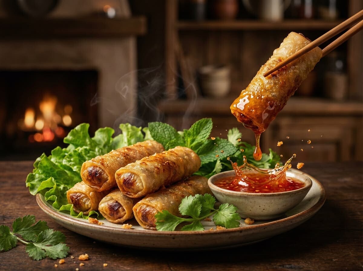 Knusprig gebratene vietnamesische Frühlingsrollen, gefüllt mit einer fein abgestimmten Mischung aus Fleisch, Glasnudeln und Gemüse. Serviert mit frischen Kräutern und einer aromatischen Dip-Sauce – der perfekte Start für ein authentisches Geschmackserlebnis.