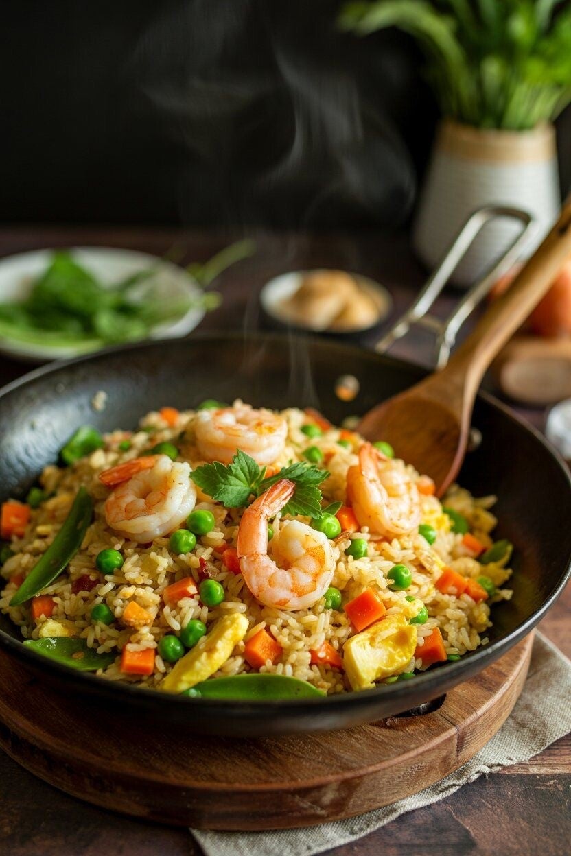 Aromatischer gebratener Reis, frisch zubereitet im Wok mit knackigem Gemüse, Ei und ausgewählten Zutaten. Verfeinert mit typisch asiatischen Gewürzen – ein herzhaftes, vielseitiges Gericht voller Geschmack.